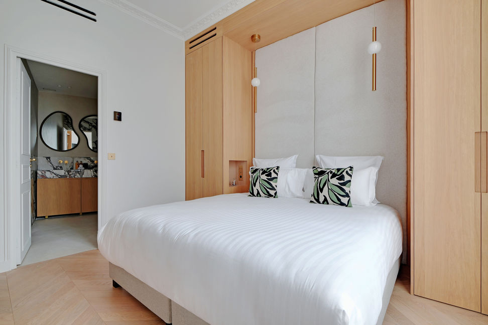 Comme au 4ᵉ étage, nous avons posé un parquet en chêne massif en pointe d’Hongrie, symbole du raffinement parisien. Chaque latte a été ajustée avec précision, poncée et traitée avec une finition haut de gamme pour un rendu chaleureux et intemporel.